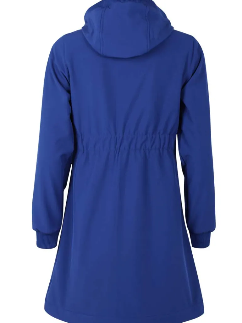 Softshellmaterialet har 8.000mm vandtæthed, som samtidig er vindtæt og åndbart. Frakken er coatet med en fluorfri coating og indeholder derfor ikke skadelige fluorcarboner. Softshellfrakken sidder elegant og feminint. Frakken har skrålommer, der lukkes med lynlås. Frakken har ribkant samt snøre ved hætten, således at hætten kan justeres for optimal pasform. Frakken har bred ribkant ved ærmerne, så vind og kulde holdes ude. Frakken har justerbar elastik nederst, således at den kan spændes tættere ind omkring benene, hvis ønsket. Frakken er inderst foret med en blød polarfleece, så den udover at være vindtæt også giver god varme til forår, efterår samt kølige sommeraftener. Frakken lukkes med en lynlås, som også kan lynes op nedefra, så man nemt kan cykle i frakken.