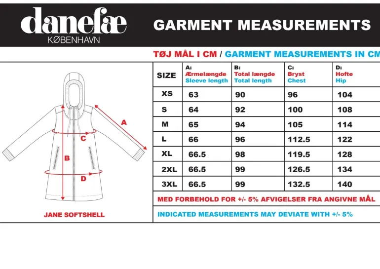 XS 90 cm, S 92 cm, M 94 cm, L 94 cm, XL 98 cm, XXL 99 cm, XXXL 99 cm.