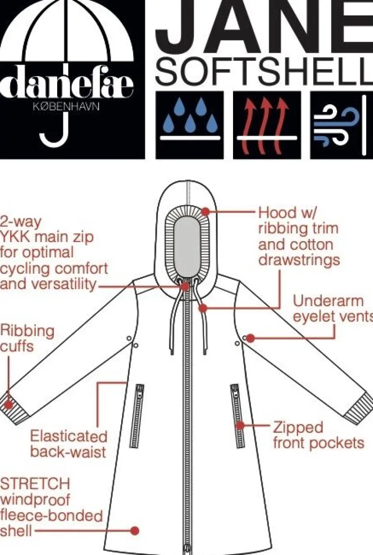Softshellfrakken sidder elegant og feminint. Frakken har skrålommer, der lukkes med lynlås. Frakken har ribkant samt snøre ved hætten, således at hætten kan justeres for optimal pasform. Frakken har bred ribkant ved ærmerne, så vind og kulde holdes ude. Frakken har justerbar elastik nederst, således at den kan spændes tættere ind omkring benene, hvis ønsket. Frakken er inderst foret med en blød polarfleece, så den udover at være vindtæt også giver god varme til forår, efterår samt kølige sommeraftener. Frakken lukkes med en lynlås, som også kan lynes op nedefra, så man nemt kan cykle i frakken.