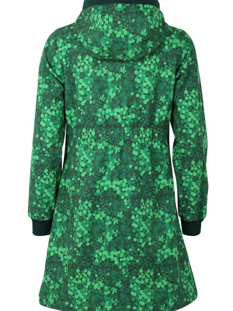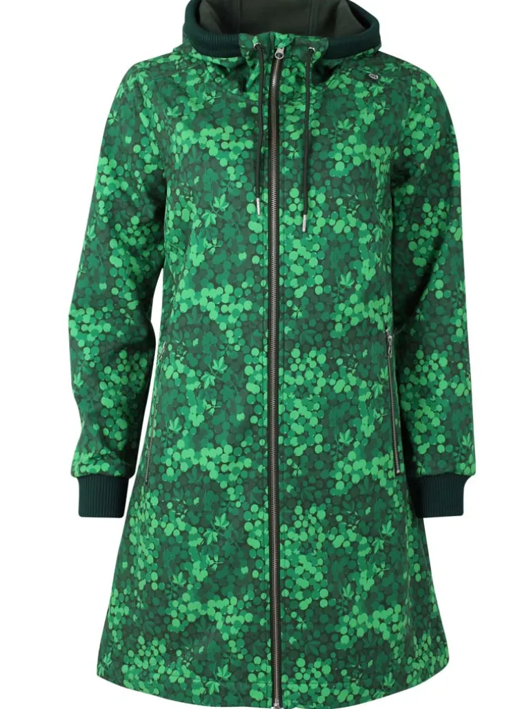 Softshellmaterialet har 8.000mm vandtæthed, som samtidig er vindtæt og åndbart. Frakken er coatet med en fluorfri coating og indeholder derfor ikke skadelige fluorcarboner. Softshellfrakken sidder elegant og feminint. Frakken har skrålommer, der lukkes med lynlås. Frakken har ribkant samt snøre ved hætten, således at hætten kan justeres for optimal pasform. Frakken har bred ribkant ved ærmerne, så vind og kulde holdes ude. Frakken har justerbar elastik nederst, således at den kan spændes tættere ind omkring benene, hvis ønsket. Frakken er inderst foret med en blød polarfleece, så den udover at være vindtæt også giver god varme til forår, efterår samt kølige sommeraftener. Frakken lukkes med en lynlås, som også kan lynes op nedefra, så man nemt kan cykle i frakken.
