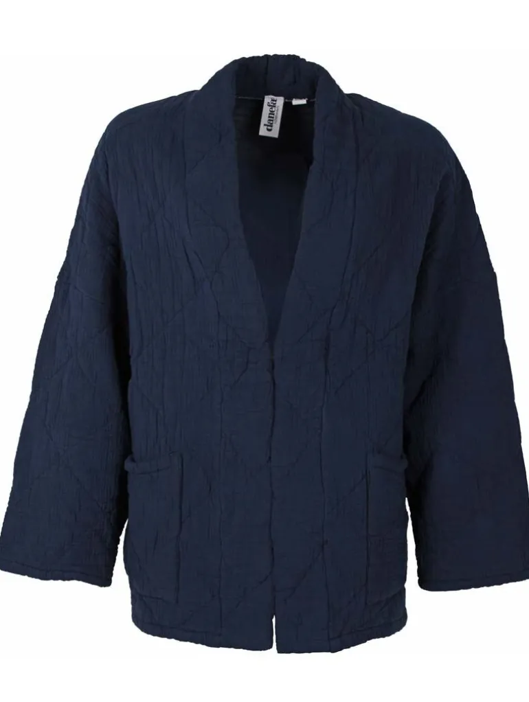 En skøn og anvendelig quiltet jakke i en fin farve. Jakken er garment dyed, hvilket giver et smukt vintage look. Brug den til hverdag og fest eller som det ekstra lag på en kølig dag. Jakken er perfekt over en skjorte og et par jeans eller over en kjole. Jakken er lavet i 100% bomuld og quiltet på en polyester vattering. Jakken er kimono inspireret uden lukning foran og har to lommer.