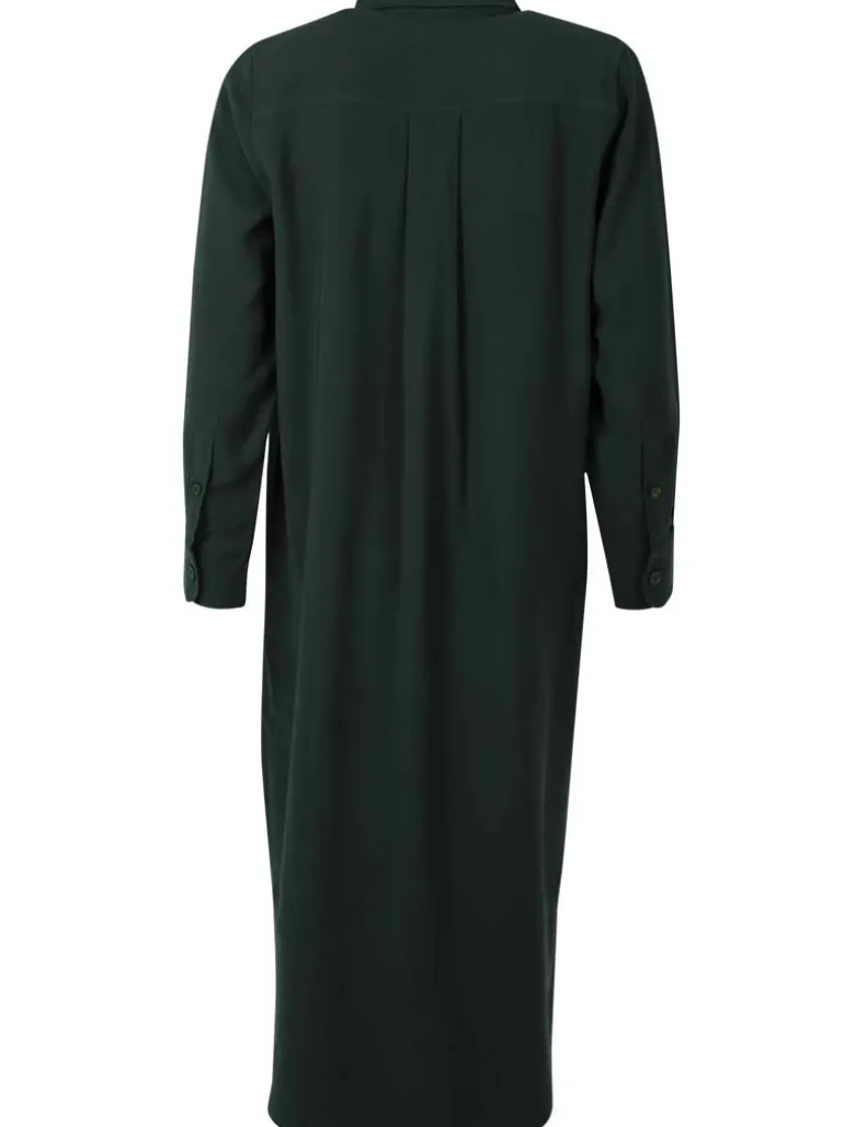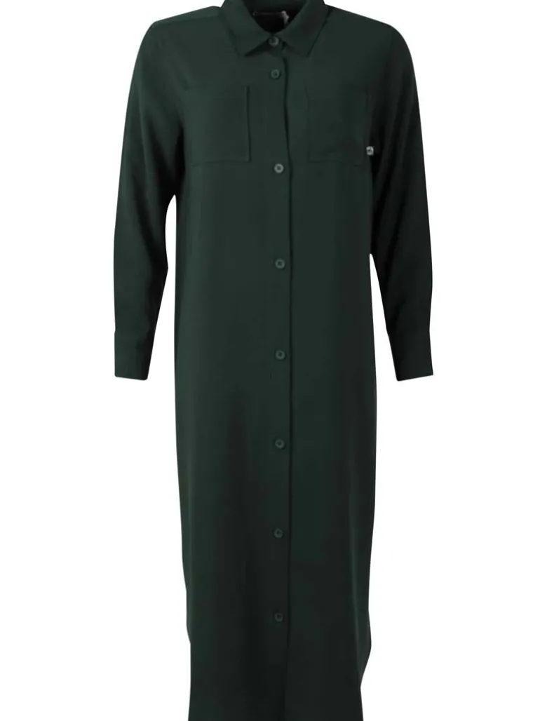 Kjolen er lang og har lange ærmer, så den er perfekt til både hverdag og fest. Kjolen er løst siddende og er behagelig at bære, både på en arbejdsdag og i fritiden. Denne feminine kjole har også en klassisk krave og påsyede lommer, samt en stolpelukning med knapper langs fronten.