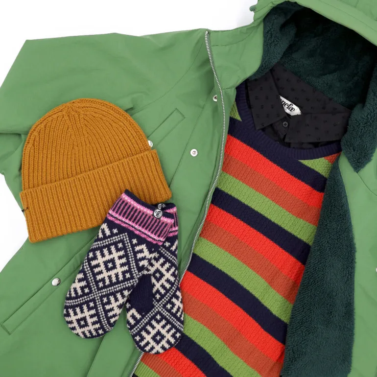 Vinterfrakken har 4 skrålommer, 2 ved brystet og 2 ved hofterne. Frakkens hætte kan snøres ind, så den sidder tæt til hovedet.
