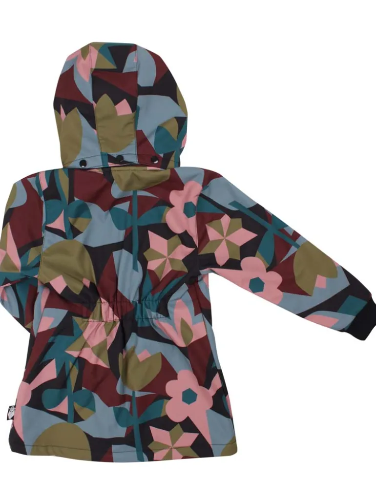 Softshellmaterialet har 3.000mm vandtæthed og er samtidig vindtæt og åndbart. Jakken er coatet med en fluorfri coating og indeholder derfor ikke skadelige fluorcarboner. Bemærk at grundet den bløde fleece på indersiden, kan man ikke tape sømmene, så jakken er ikke 100% vandtæt, da der ved tung regn kan trænge vand ind i sømmene. Jakken har aftagelig hætte for barnets sikkerhed. Jakken har bred rib ved håndleddene, så vinden holdes ude. Jakken har to lynlåslommer foran og elastik i ryggen, så jakken får en feminin pasform. Jakken kan spændes ind forneden, så den kan sidde tæt om benene. Jakken er produceret under BSCI-certificerede forhold. Softshelljakken kan vaskes i maskine ved 30 grader. Generelt anbefales det, at man vasker overtøj mindst muligt.