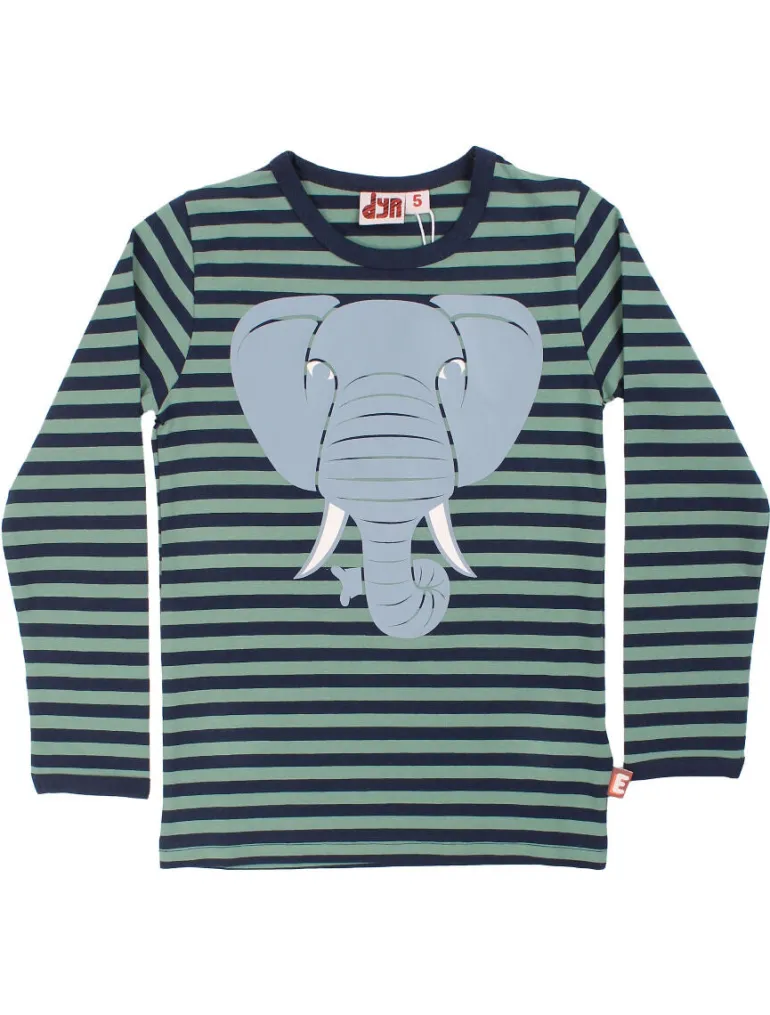 Skøn bluse fra DYR med en sød elefant, som sætter gang i fantasien og giver plads til masser af sjov leg. Lavet i bløde materialer, så blusen er dejlig at have på. Materialet består af 95% bomuld (180 gram) og 5 % elastan.