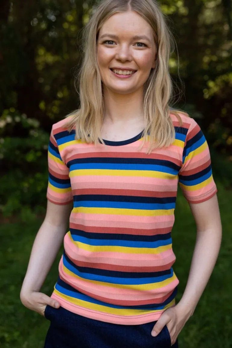 Fin og klassisk t-shirt i en lækker bomulds/modal rib bestående af 50% bomuld, 45% modal og 5% elastan. Kvaliteten er dejlig let og har god strækbarhed for ekstra komfort. T-shirten har en rar pasform, og er super behagelig at have på. Et must til basis-garderoben!