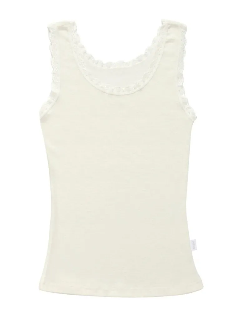 Undertrøje. Sød blondekant i hals og ærmegab. Dejlig blød, elastisk ogribbet uldkvalitet. Kvalitetens strækevne gør at den er behagelig athave på inderst. Brug den gerne som en sød lille top. Ensfarvet. Puremerino wool og Oeko-tex 100 mærket.