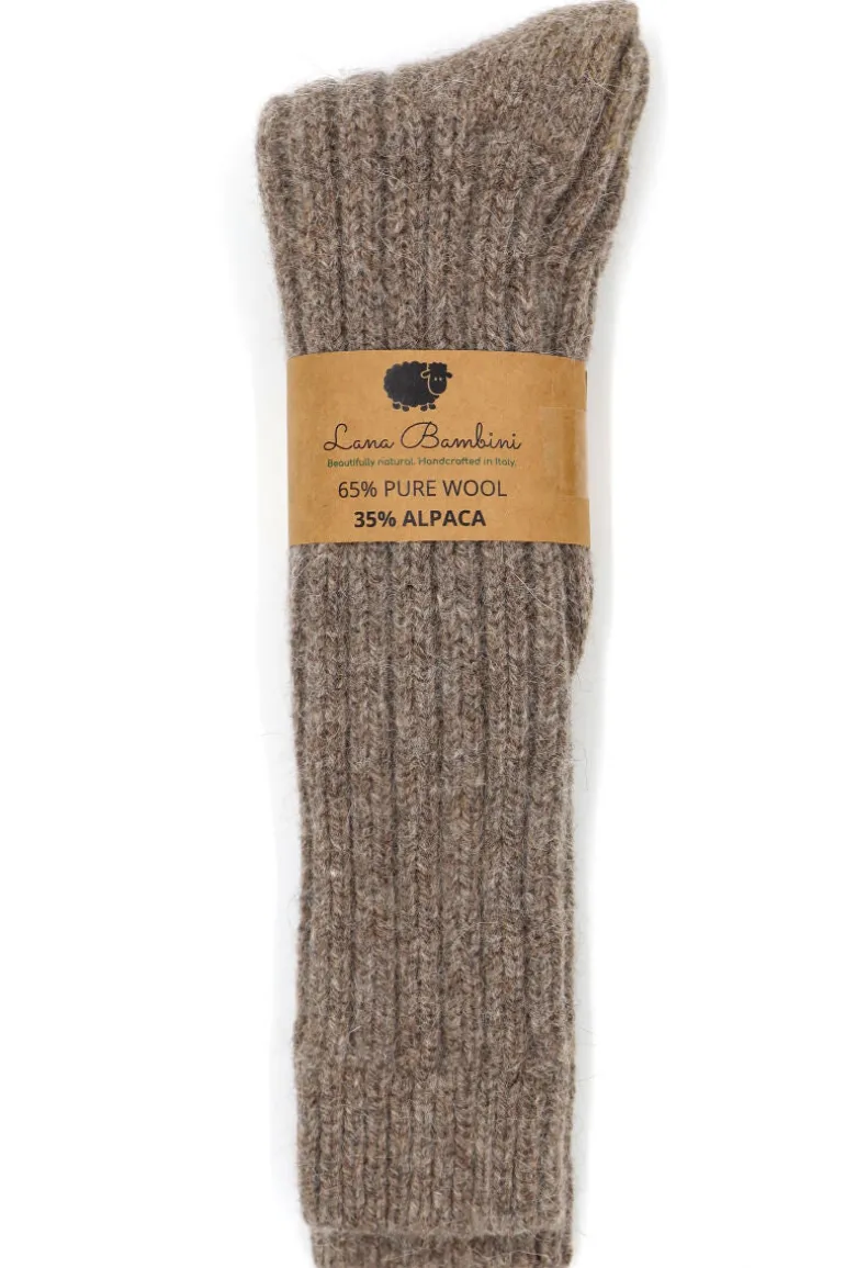 – Tykke uldsokker- Bløde og varme- Perfekte til vinterSuper lækre og tykke uldsokker fra Lana Bambini. Sokkerne er i en lækker, varm kvalitet og består af 65% fåreuld og 35% alpaca uld. Det lune uld materiale gør sokkerne perfekte til de kolde vinterdage, hvor sokkerne gerne må være lidt hyggelige.Vaskeanvisning: da sokkerne består af uld anbefaler vi at de enten håndvaskes eller vaskes i maskine på et skåne/uld program. Sokkerne må ikke tørretumbles men skal i stedet hænges til tørre. Lana Bambini er en familiedrevet virksomhed med rødder i det nordlige Italien. Virksomheden går meget op i at producere produkter af høj kvalitet som holder i mange år frem, og som er fremstillet på en etisk ansvarlig og miljøvenlig måde. Af samme årsag er alle produkter fra Lana Bambini lavet af naturlige materialer såsom alpaca uld, økologisk bomuld, biologisk hamp, osv. Lana Bambini er særligt kendt for deres lækre, håndlavede sokker af høj kvalitet som er komfortable, åndbare og anti-allergifremkaldende.