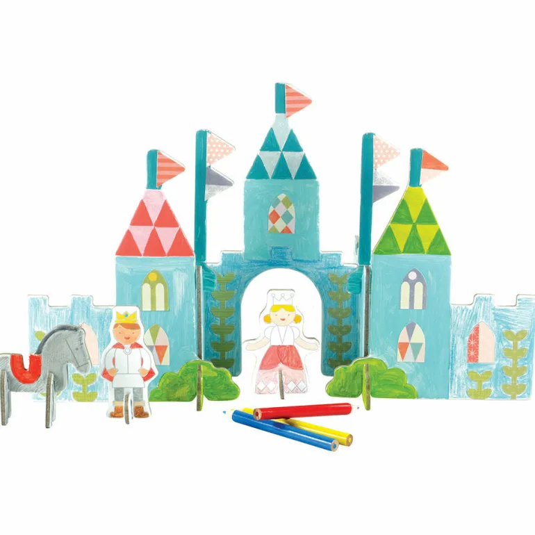 Hvert sæt leveres med 32 stickers og 5 farveblyanter og har robuste former, der lige er til at sætte sammen. Du kan selv farvelægge og sætte klistermærker på og så er du klar til dit eget eventyr.