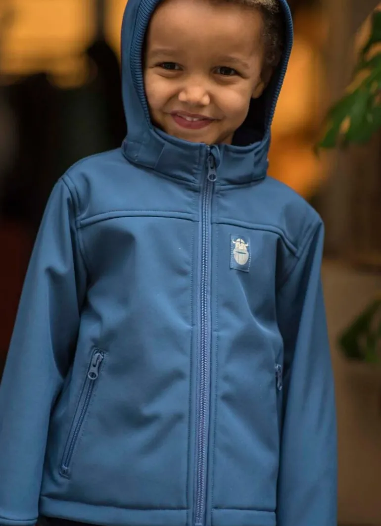 Softshellmaterialet har 3.000mm vandtæthed og er samtidig vindtæt og åndbart. Jakken er coatet med en fluorfri coating og indeholder derfor ikke skadelige fluorcarboner. Bemærk at grundet den bløde fleece på indersiden, kan man ikke tape sømmene, så jakken er ikke 100% vandtæt, da der ved tung regn kan trænge vand ind i sømmene. Jakken har aftagelig hætte for barnets sikkerhed. Jakken har bred rib ved håndleddene, så vinden holdes ude. Jakken har to lynlåslommer foran og en stor refleks bagpå.