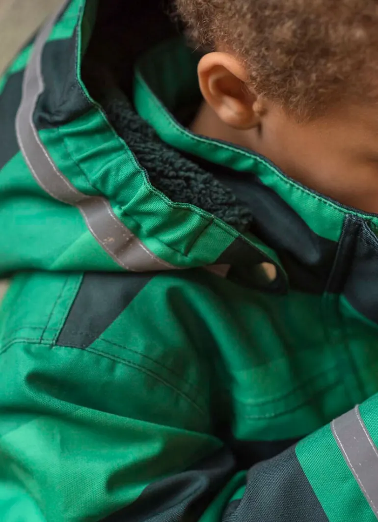 Lækker flyverdragt i skøn farve. Dragten er lavet i slidstærkt materiale med varmt Termolite for. Flot facon og fine praktiske detaljer, blandt andet vindfang ved ærmerne og store lommer til lufferne. Refleksbånd ved ærmerne og benene. Flyverdragten er foret med blød fleece i hele overkroppen, i skødet og på numsen samt i hætten. Flyverdragten er vind- og vandafvtæt (5.000 mm). Meget velegnet til udendørsleg, da den holder barnet varmt. Også på skituren. Der er garanti for at blive set på legepladsen med de skønne farver! Flyverdragten er produceret under BSCI-certificerede forhold. Flourfri coating (Bionic Finish). Danefæs børnetøj indeholder ingen skadelige stoffer.
