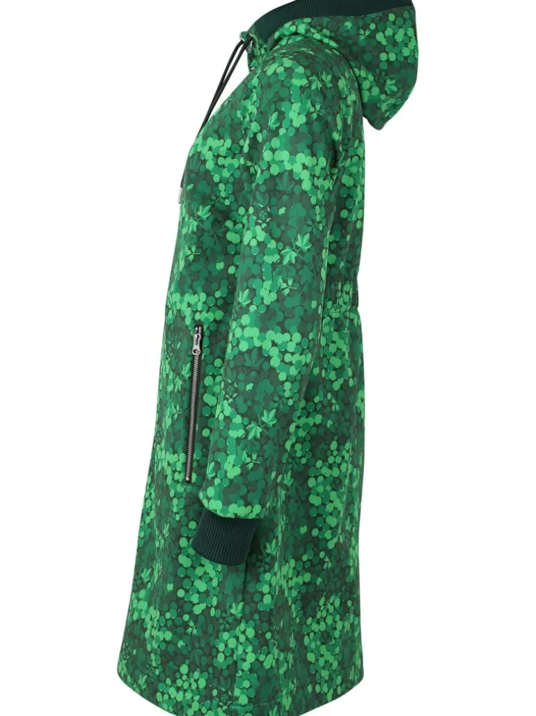 Softshellmaterialet har 8.000mm vandtæthed, som samtidig er vindtæt og åndbart. Frakken er coatet med en fluorfri coating og indeholder derfor ikke skadelige fluorcarboner. Softshellfrakken sidder elegant og feminint. Frakken har skrålommer, der lukkes med lynlås. Frakken har ribkant samt snøre ved hætten, således at hætten kan justeres for optimal pasform. Frakken har bred ribkant ved ærmerne, så vind og kulde holdes ude. Frakken har justerbar elastik nederst, således at den kan spændes tættere ind omkring benene, hvis ønsket. Frakken er inderst foret med en blød polarfleece, så den udover at være vindtæt også giver god varme til forår, efterår samt kølige sommeraftener. Frakken lukkes med en lynlås, som også kan lynes op nedefra, så man nemt kan cykle i frakken.
