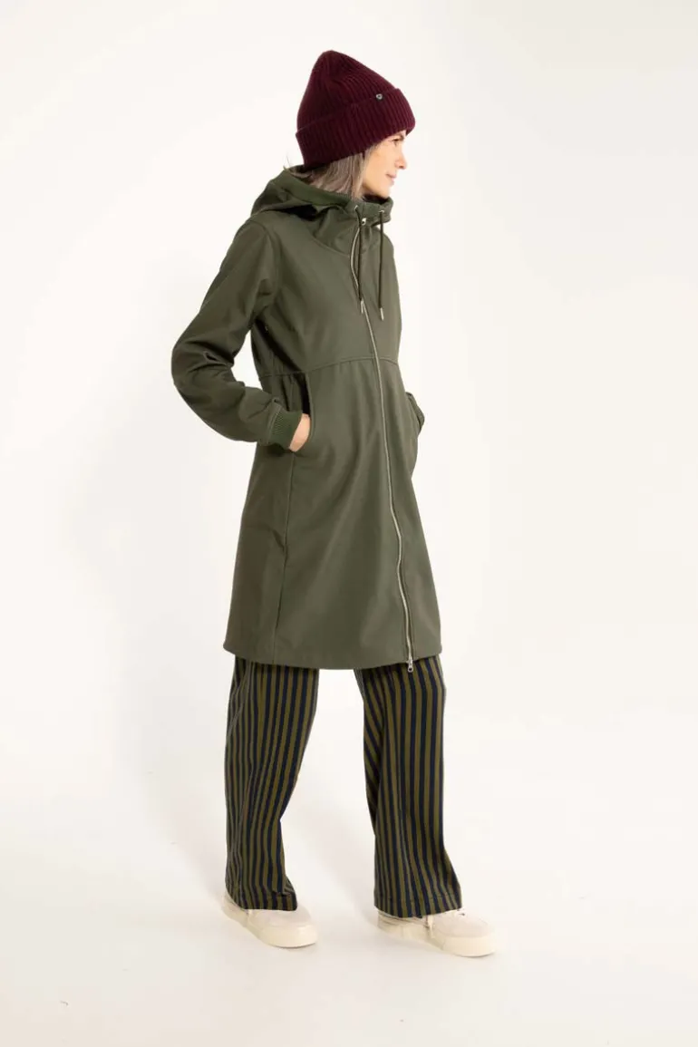 Softshellmaterialet har 8.000mm vandtæthed, som samtidig er vindtæt og åndbart. Frakken er coatet med en fluorfri coating og indeholder derfor ikke skadelige fluorcarboner. Softshellfrakken sidder elegant og feminint. Frakken har skrålommer. Frakken har ribkant samt snøre ved hætten, således at hætten kan justeres for optimal pasform. Frakken har bred ribkant ved ærmerne, så vind og kulde holdes ude. Frakken har justerbar elastik nederst, således at den kan spændes tættere ind omkring benene, hvis ønsket. Frakken er inderst foret med en blød polarfleece, så den udover at være vindtæt også giver god varme til forår, efterår samt kølige sommeraftener. Frakken lukkes med en lynlås, som også kan lynes op nedefra, så man nemt kan cykle i frakken.