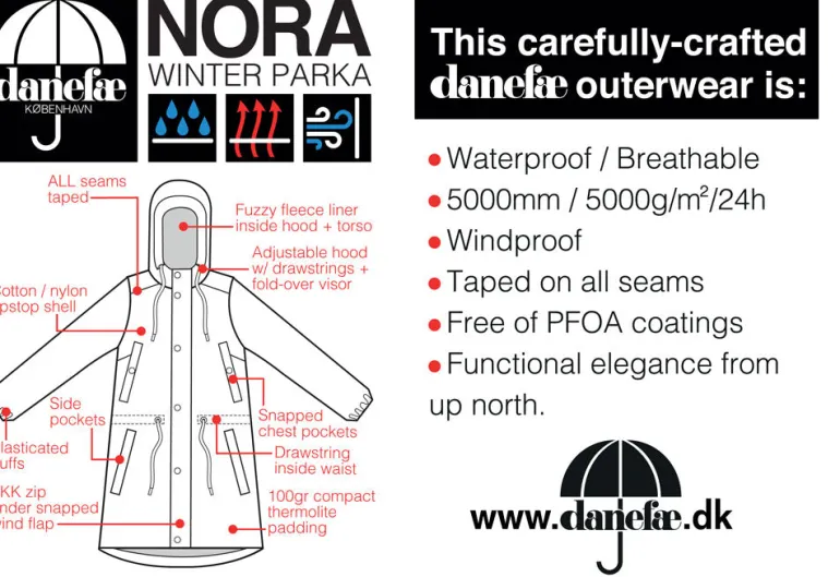 Nora Vinter Parka er en klassisk og teknisk vinterfrakke, som holder regn, sne og kulde ude. Og varmen inde.