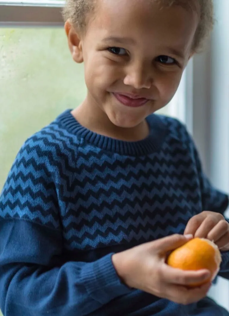 Pasformen er blød og behagelig og giver masser af plads til leg og bevægelse. Samtidig er sweateren nem at tage af og på.