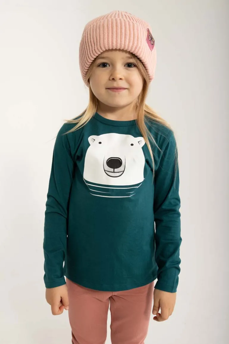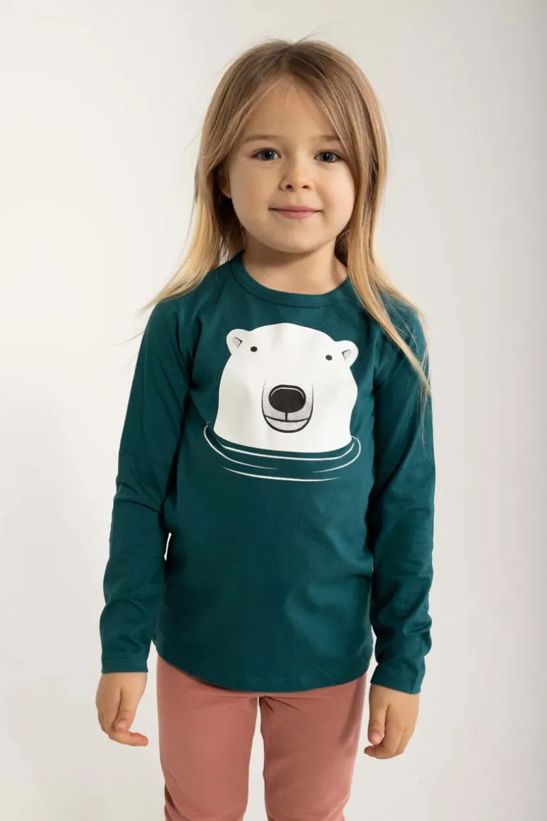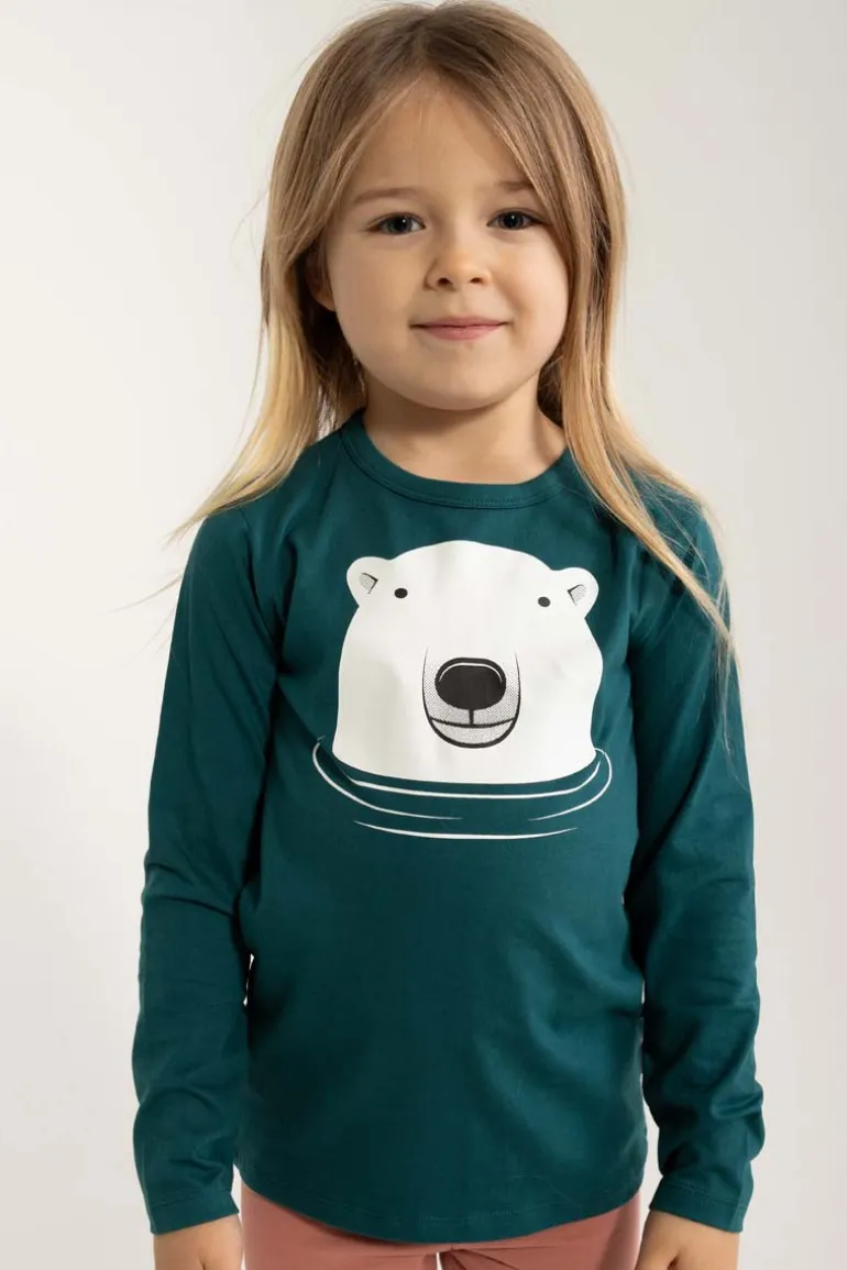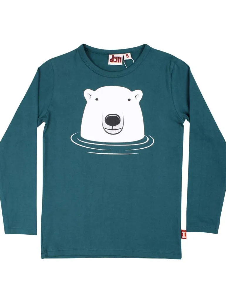 Skøn bluse fra DYR med en skøn isbjørn, som sætter gang i fantasien og giver plads til masser af sjov leg. Lavet i bløde materialer, så blusen er dejlig at have på. Materialet består af 95% bomuld (180 gram) og 5 % elastan. Print, farve og form holder vask efter vask, så blusen bliver ved med at se lækker ud også efter mange vaske, og så blusen kan gå i arv og miljøet skånes.