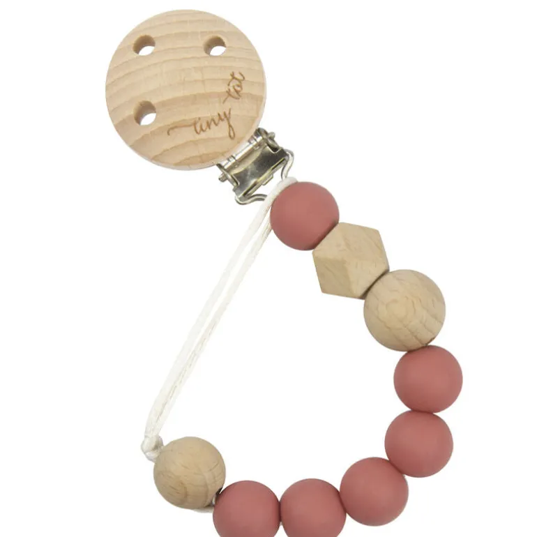 Suttekæden er produceret af 100% fødevaregodkendte silikoneperler og håndpolerede bøgetræsperler, som sammen giver et unikt design. Passer perfekt til barnets outfit og holder sutten nemt på plads.