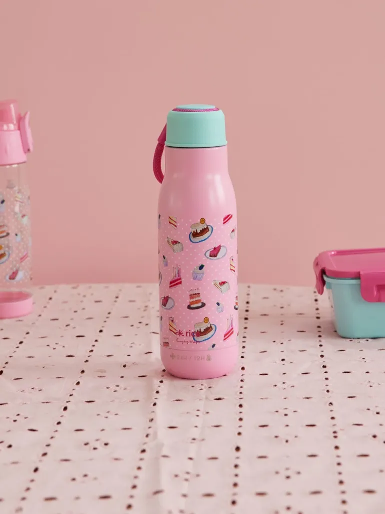 Nyd dine yndlingsdrikke med stil med vores lyserøde drikkedunk med Sweet Cake print. Denne 500 ml flaske er den perfekte makker… den holder dine drikkevarer varme i 12 timer og kolde i 24 timer. Låget, som kan skiftes ud med andre farver, kommer med en praktisk rem, så du nemt kan hænge drikkedunken i din taske, hvis du er på farten.