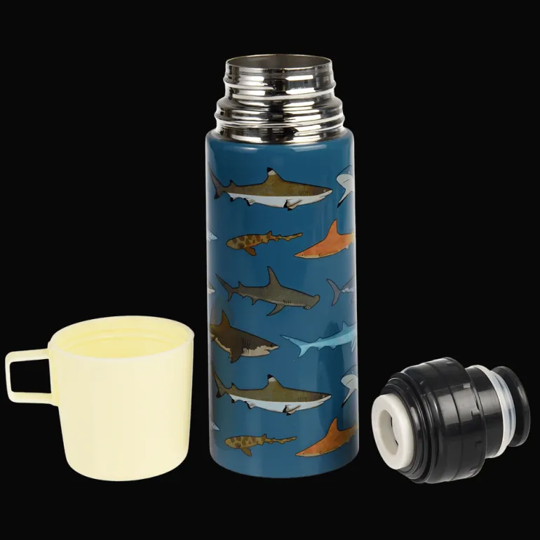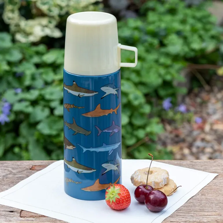 This stainless steel vacuum flask, with combined plastic cup and lid, will keep your drinks warm whilst traveling, picnicking or commuting. Featuring our bold Sharks print, this flask is a fun way to enjoy your favourite hot drinks without single-use cups.Capacity: 350mlPush-top stopper to prevent leakageDo not microwave or freezeNot dishwasher safeBPA-free plasticDimensions: 20.5 cm