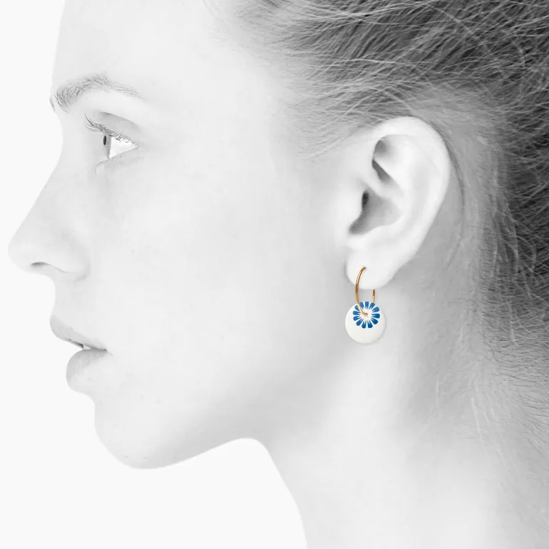 Øreringe med vedhæng af hvidt porcelæn, med SCHERNING’s klassiske BLOOM dekoration i flot dyb blå.Forgyldt sterling …